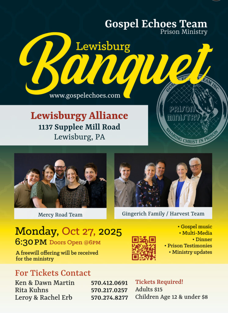 BANQUET, Lewisburg Alliance Church, Lewisburg, PA. 137 Supplee Mill RD 6:30 pm Tickets: Ken & Dawn Martin 570.412.0691